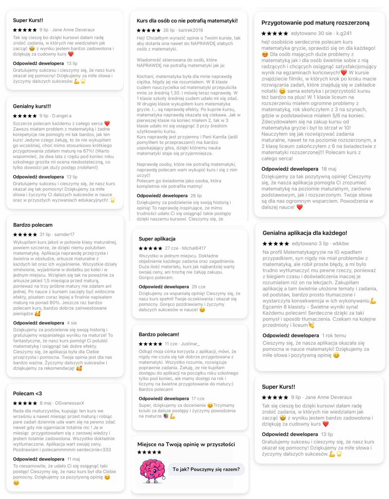 Wolne miejsca na lekcje indywidualne znajdą Państwo tutaj, zachęcam też do skorzystania z moich kursów online. To kompleksowe rozwiązanie zastępujące korepetycje. Rodzice uczniów oraz uczniowie bardzo często piszą do mnie wiadomości z podziękowaniem, że kurs jest 100 razy lepszy niż korepetycje i w końcu zaczęli rozumieć matematykę.